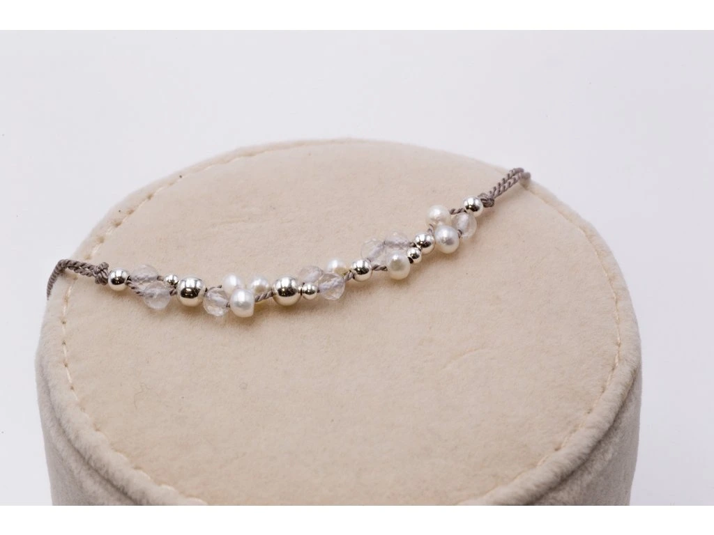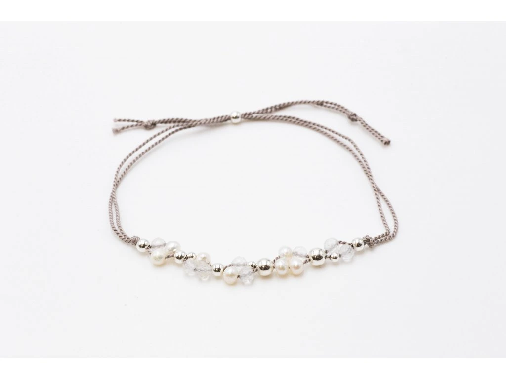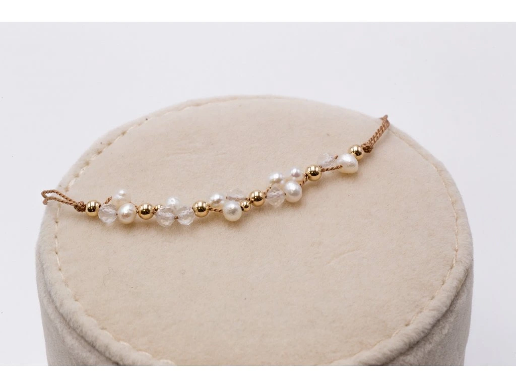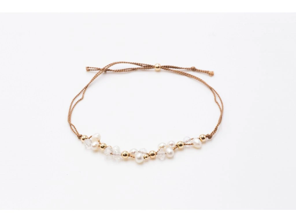 Spojte se s přírodou díky tomuto delikátnímu náramku z přírodní hedvábné šňůrky, kterou zdobí jemné perly, třpytivé minerály a korálky z ušlechtilého kovu.